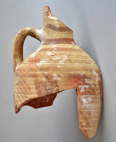 Stato di conservazione / restauri: Frammentaria; mancante dell’orlo, di un’ansa, di buona parte della pancia e del fondo