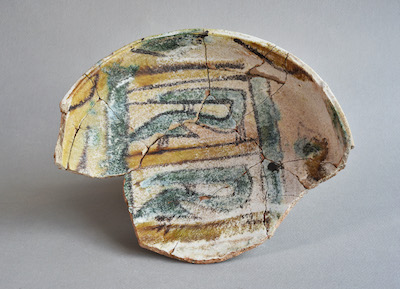 Descrizione: Ciotola con orlo bifido, parete verticale, vasca carenata; decorazione policroma sotto vetrina. All’interno motivi pseudoepigrafici in verde entro bande verdi e gialle delimitate in bruno; sulla parete semicerchi penduli alternati, in verde e giallo, delimitati in bruno; all’esterno, tratti in bruno e punti in verde.