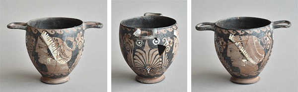 Sulle due facce, teste femminili di profilo verso sin., con chiome raccolte in un sakkos, presentano minime variazioni nel disegno. Sotto le anse, palmette affiancate da motivi vegetali con doppi girali e fiori campanulati al centro. Motivo a onda sull’orlo e alla base della vasca.